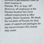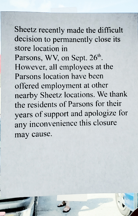 PARSONS — The Sheetz gas station and convenience store in Parsons has announced to its employees and the residents of Tucker County that it will be closing its doors officially on Sept. 26.