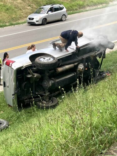 Witnesses try to help remove a victim from a one-vehicle rollover wreck on North Randolph Avenue Seneca Trail in Elkins after 5 p.m. Tuesday afternoon. The accident resulted in the northbound lane being temporarily blocked ...