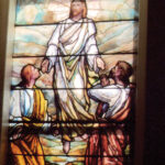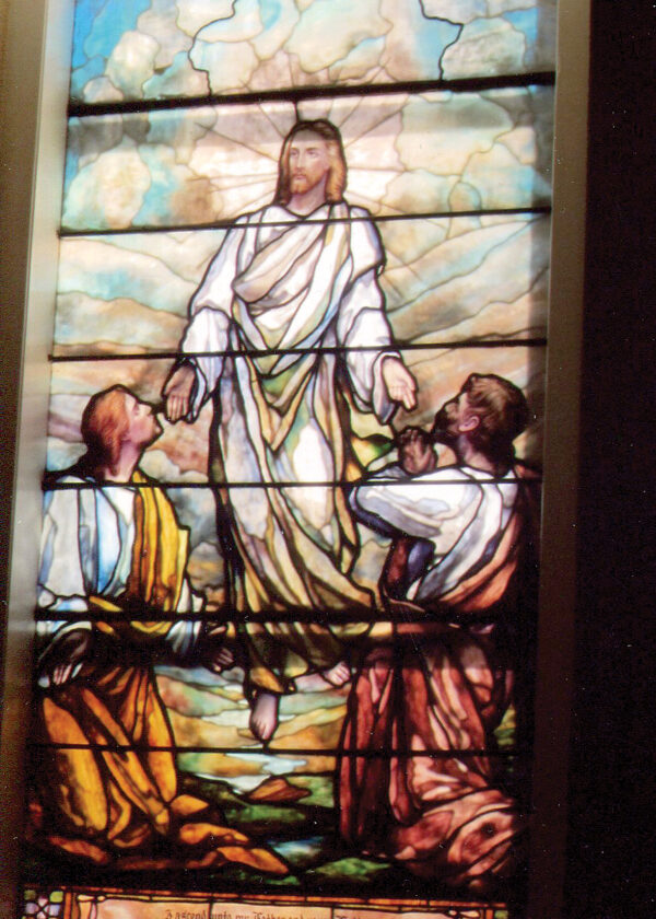 A stained-glass Church window depicts Christ’s recovery from death and ascension as described in the Holy Bible
