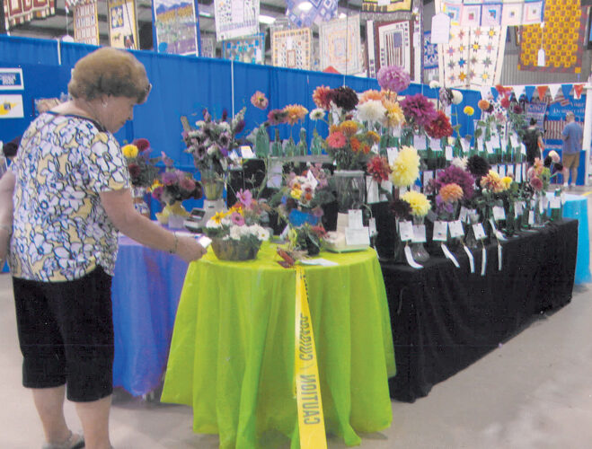 Huttonsville resident Dorothy Wamsley looks at quilts and flowers during the state fair.