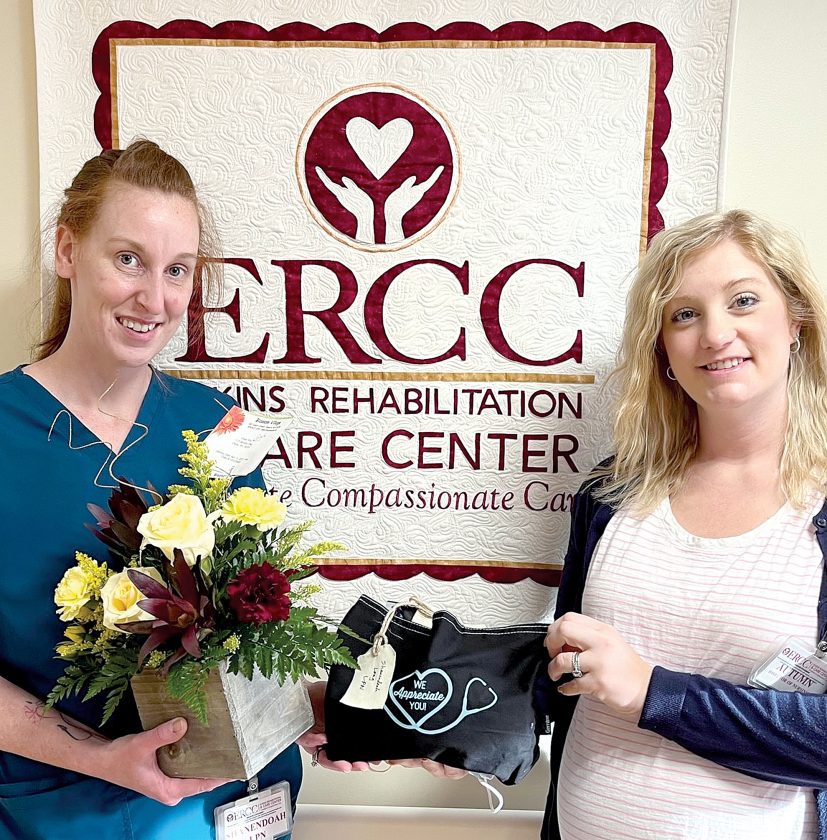 Shanendoah Long passed her licensed practical nurses board exam on April 5, and now works as an LPN at Elkins Rehabilitation & Care Center. Long took her CNA classes at ERCC in the fall of 2018 and was hired as a nurses aide in December of that year, becoming a certified nursing assistant in February of 2019. She graduated from the Randolph County Technical Center’s LPN program in 2022 and began working at ERCC as a graduate practical nurse in February. Pictured above, Long, left, receives congratulatory gifts and flowers from ERCC Director of Nursing Autumn Elza.