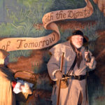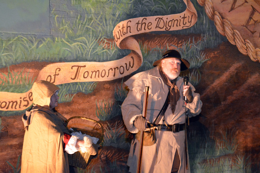 The Inter-Mountain photo by Roger Adkins Sandee and Gene Thorn perform an historical re-enactment Friday during a rededication of the mural depicting the Buckhannon City Seal at Main and Locust streets