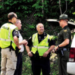 The Inter-Mountain photos by Tim MacVean Law enforcement officials with the Barbour County Sheriff’s Department, West Virginia State Police and Philippi Police Department converse after an explosion at Midland Resource Recovery, a gas company located along Barbour County Highway in Moatsville, which took the lives of two people and forced another to be taken by helicopter to a hospital in Morgantown Wednesday afternoon.