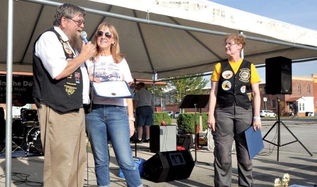 George Murphy, left, district director of the Gold Wing Road Riders Association West Virginia District, presents a certificate of appreciation Thursday to Brenda Pritt, center, executive director of the Randolph County Convention & Visitors Bureau. Murphy’s wife, also named Brenda, is shown at right. The GWRRA’s West Virginia Rally kicked off Thursday and will continue in Elkins through this weekend.