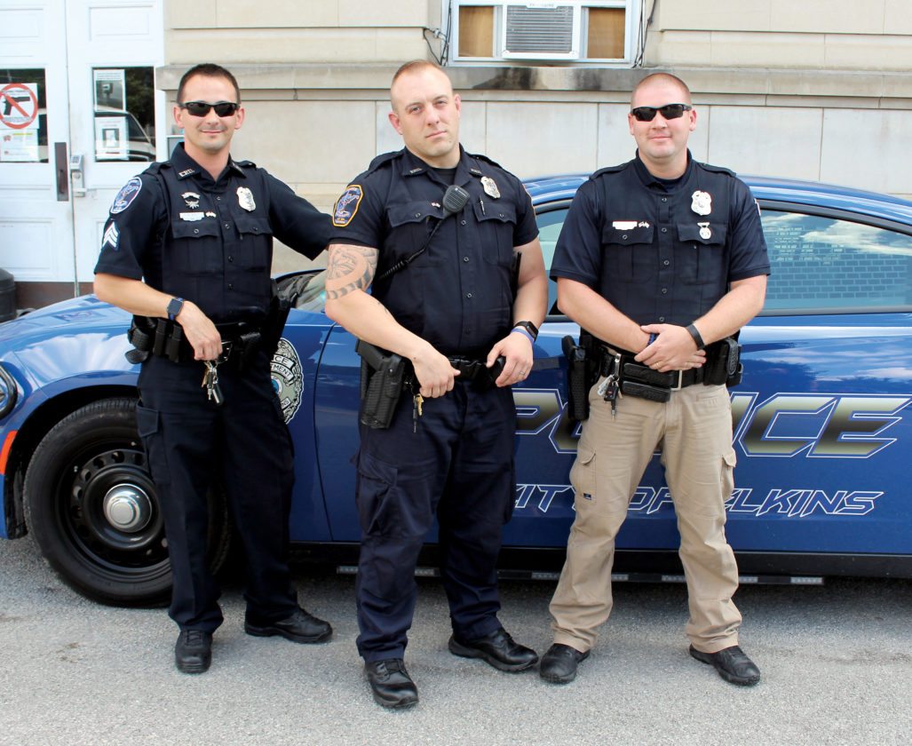The Inter-Mountain photo by Brooke Binns The newest officer of the Elkins Police Department Patrolman W.D. Butcher, center, is pictured with fellow officers Sgt. R.W. Belt, left, and Cpl. M.J. Sigley, right.
