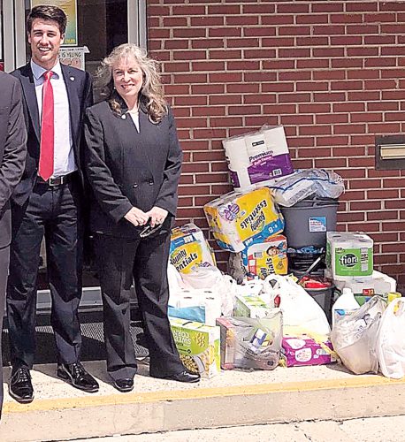 Submitted photo Dr. Mirta Martin, Fairmont State University president, and the college’s Tyler Keller display the school’s donation of cleaning supplies and food for the Harman area