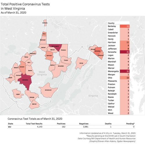 According to the Department of Health and Human Resources, there are now 17 new cases of the coronavirus — or COVID-19 — in the state since Monday evening, bring the total of positive cases to 162 and the total of negative cases to 3,981. The National Guard is assisting the DHHR lab and the Bureau of Public Health in turning around test results more quickly and helping conduct investigations into positive cases.