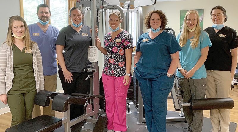 Submitted photo Elkins Rehabiliation & Care Center reopened its doors to outpatient rehabilitation services on June 1. Pictured from left are ERCC’s rehabilitation services staff members: Shelby Glenn, rehabilitation technician, Justin Thompson, certified occupational therapy assistant, Lindsay Zirkle, occupational therapist, Alissa Kerns, physical therapy assistant, Angela Row, physical therapy assistant, Kristina Heitz, physical therapist and Gretchen Price, speech language pathologist. Not pictured are Vonda Anthony, rehabilitation technician, and Lona Markley, occupational therapist.