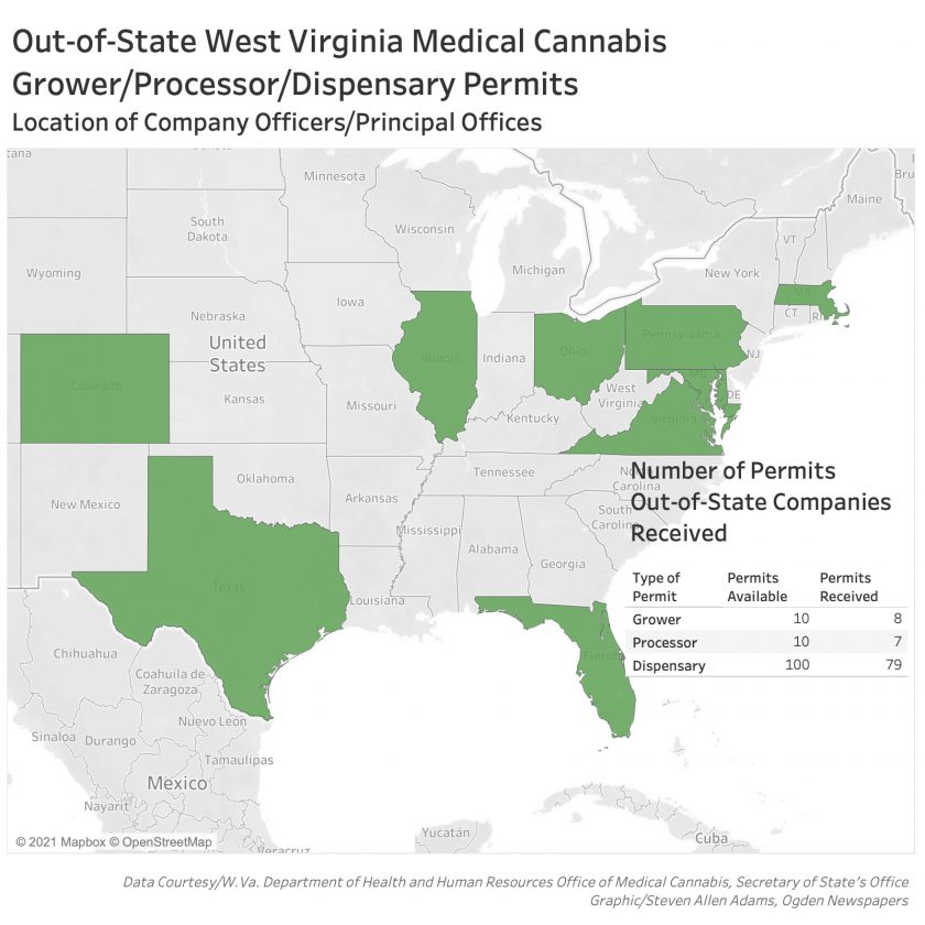 According to a review of the selected dispensaries and processors selected by the Office of Medical Cannabis and a search of business records through the West Virginia Secretary of State’s Office, 22 of the 32 companies selected as dispensaries involved out-of-state entities, controlling 79 of the 100 dispensary locations.
