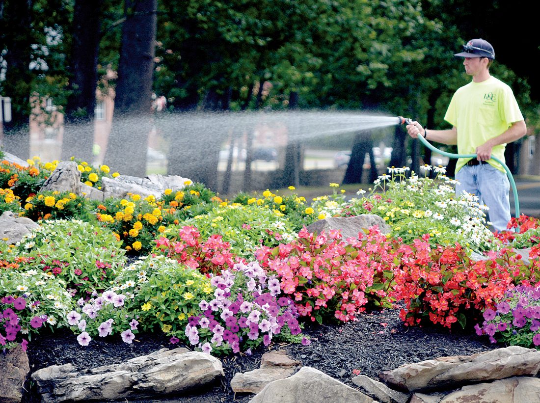 The Inter-Mountain photo by Edgar Kelley Davis & Elkins College employee Tyler Rubasky waters the flowers at the Iron Horse Statue on Harrison Avenue in Elkins.