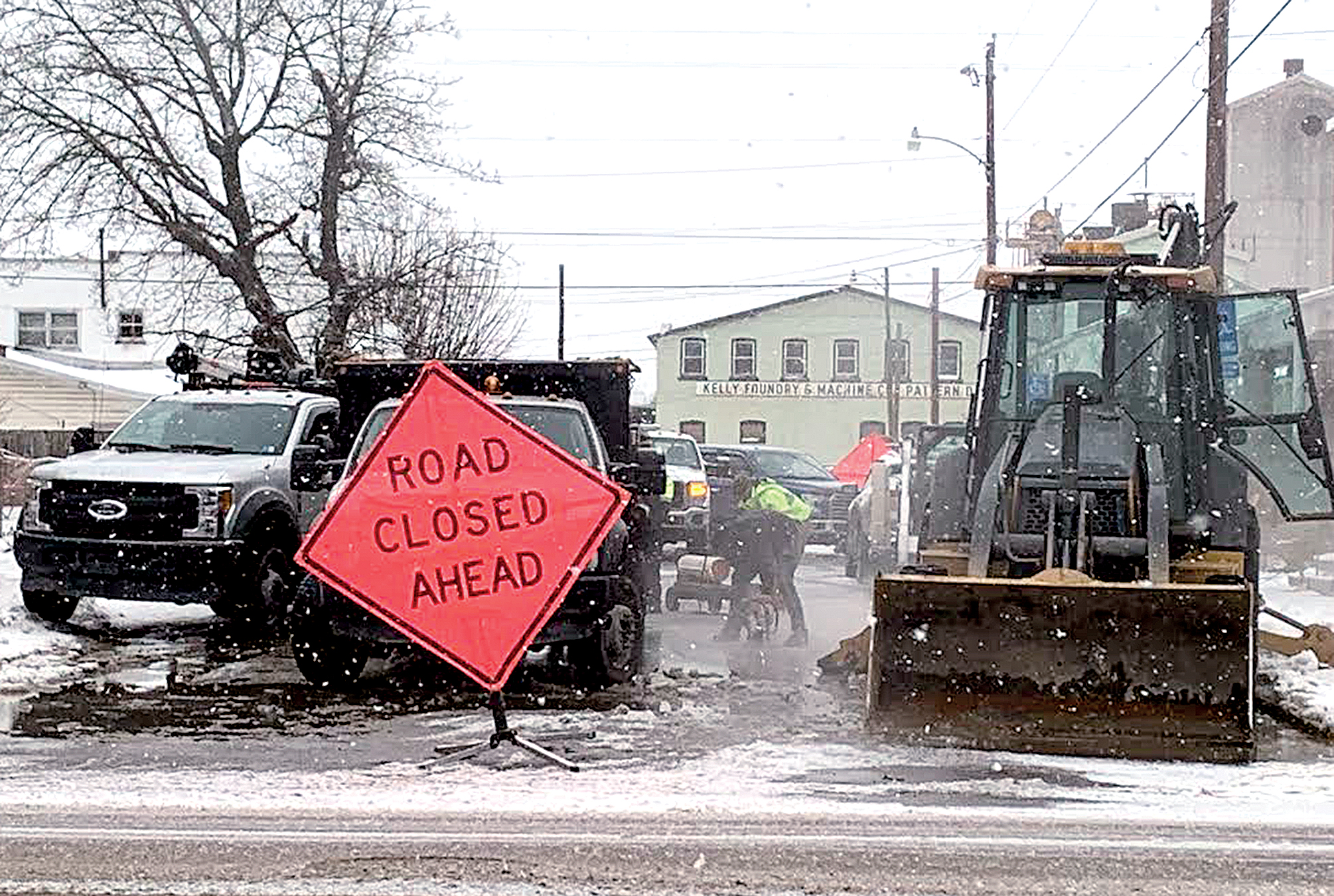 The Inter-Mountain photo by Edgar Kelley Water Department personnel with the CIty of Elkins work to repair a water leak on 10th Street Thursday afternoon. Crew members braved the harsh weather elements for most of the afternoon.