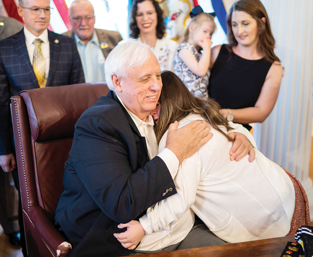 Photo Courtesy/WV Governor’s Office During an earlier bill signing this week, Gov. Jim Justice receives a hug from a child with Down Syndrome. Justice signed two bills Friday to help protect special needs students in classrooms.