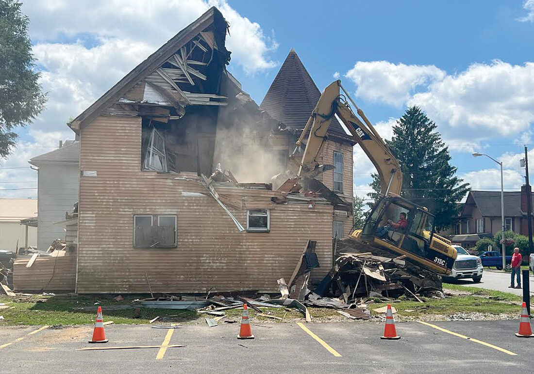Contractors working for the City of Elkins demolish what the city referred to as ‘a longtime dilapidated and nuisance property’ at 943 South Davis Avenue Monday. The house was taken down in accordance with a recent court order.