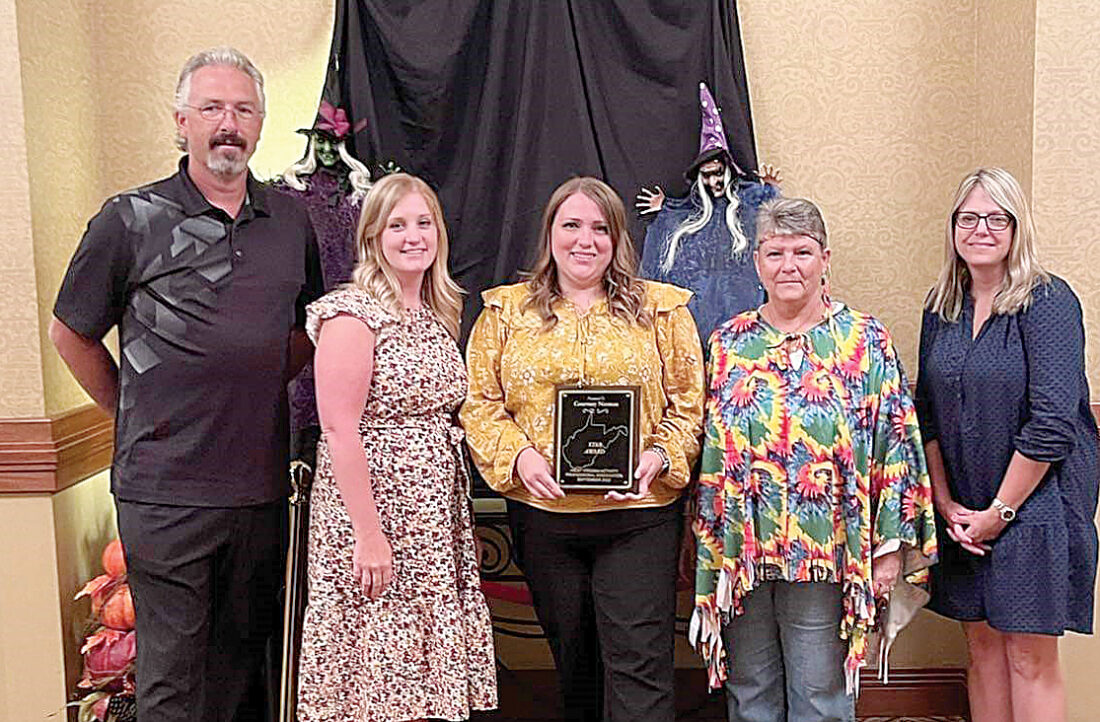 Submitted photo ERCC Transportation Aide Courtney Norman is presented an engraved plague for winning the West Virginia Activity Professionals Association Star Award. Pictured from left are Kevin Blosser, director of maintenance; Autumn Elza, director of nursing; Courtney Norman; Donna Jones, director of activities; and Tara Shaver, administrator.