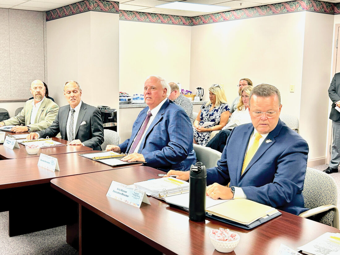 Photo by Steven Allen Adams Gov. Jim Justice, center, urges members of the West Virginia Economic Development Authority to approve forgivable loans for the Point Pleasant Mountaineer GigaSystem project