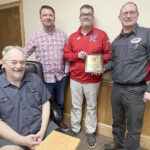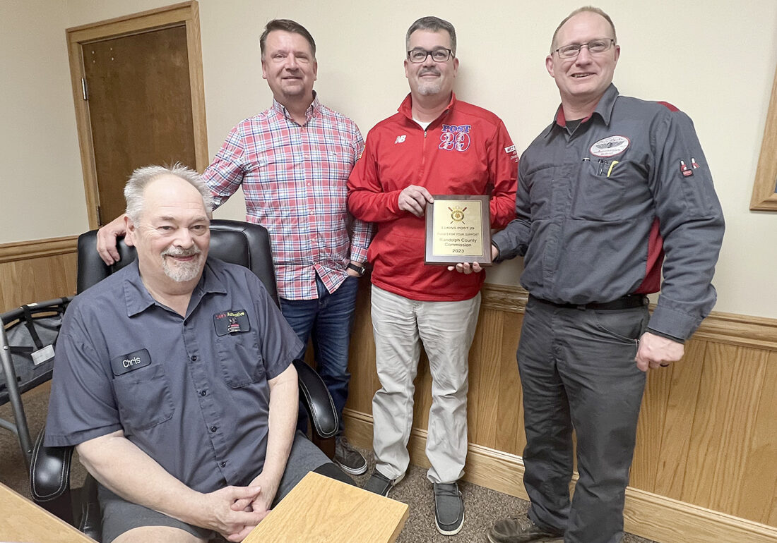The Inter-Mountain photo by Edgar Kelley The Randolph County Commission approved a funding request from Elkins American Legion baseball at its regular meeting on Thursday. Commissioners, front left, Chris See, David Kesling and Cris Siler were presented a plaque of appreciation from Post 29 manager Phil Wilson for the RCC’s years of support.