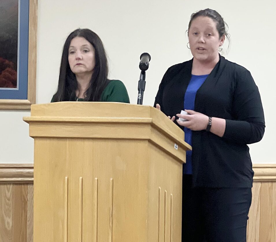 The Inter-Mountain photo by Edgar Kelley Shelby Wilson, left, and Elizabeth Shahan spoke to the Randolph County Commission about its Opioid Settlement money during the Commission’s most recent meeting at the James F. Cain Courthouse Annex.