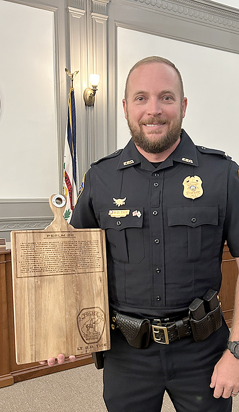 The change of rank was administered by Bennett and Lieutenant Christopher Boatwright. Tice was called forward by Bennett to stand before him, Boatwright and the city council. Bennett then switched Tice’s badge from the sergeant silver to the lieutenant gold, which, according to Bennett, denotes the importance of the promotion.