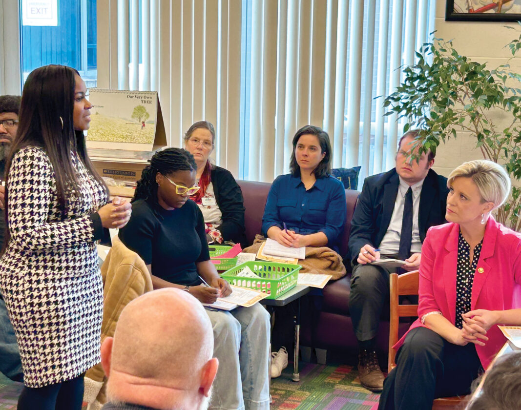 Photo by Steven Allen Adams Senate Education Committee Chairwoman Amy Grady, right, sitting, listens as Mary C. Snow Elementary School Principal Destiny Spencer, standing, left, explains her school’s successes at bringing the number of student suspensions down.