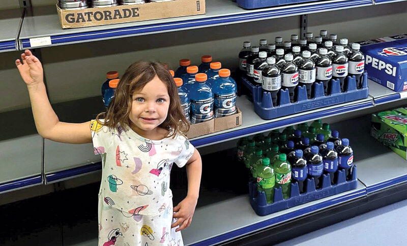 Wilma Anderson’s daughter Emma stands in front of a shelf of products offered at the Coalton Country Market. The store is currently open Mondays through Saturdays 7 a.m. to 7 p.m.