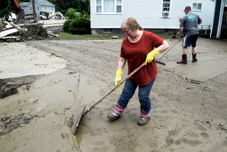 Darlene Philabaum pushes muck away from her family’s business, Philabaum Garage and Auto Repair, on Monday in the aftermath of the flash floods that ravaged Valley Grove and other communities in Ohio County.