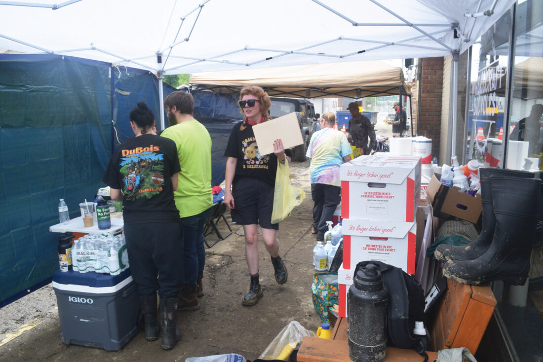 Photos by Derek Redd Polly Barks, center, volunteer coordinator for Ohio Valley Mutual Aid, walks through the organization’s tent in Elm Grove as she deploys more teams into the community to help residents clean their homes after the floods.