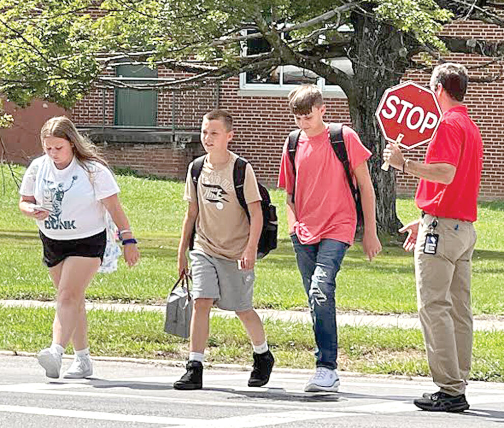 The Inter-Mountain photo by Edgar Kelley Elkins MIddle School Band Director Jason Baker stops traffic on Robert E. Lee Avenue Monday afternoon to allow a group of EMS students to cross the street safely on Randolph County’s first day of school.