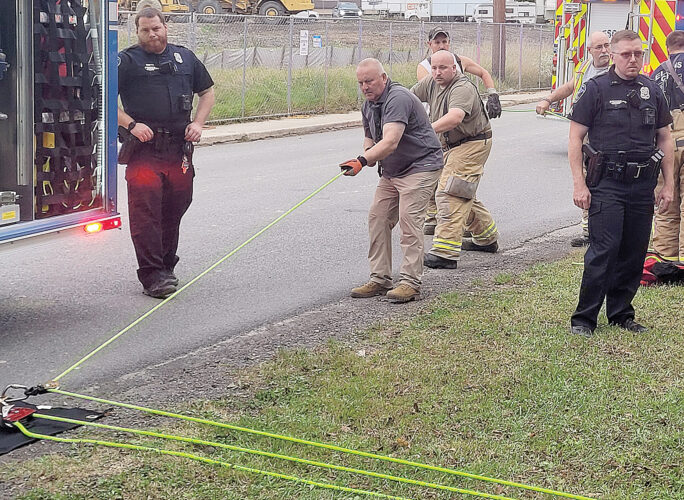 Elkins Fire Department firefighters use ropes and pulleys to assist in getting the driver up the river bank. A small dog was also rescued from the vehicle. The driver was transported for care by the Randolph County Emergency Squad.