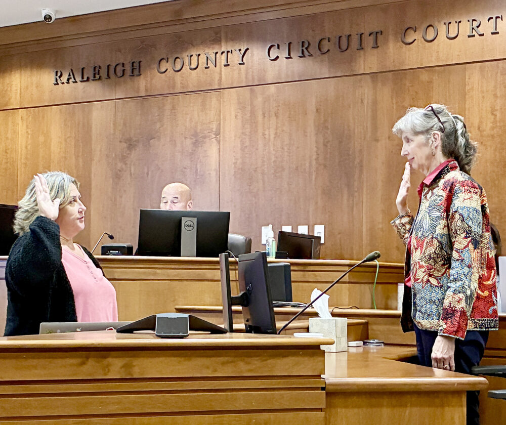 Photo by Steven Allen Adams Pictured right, Dr. Cathy Slemp, a former state health officer and commissioner of the West Virginia Bureau of Public Health, is sworn prior to giving expert testimony on the importance of the state compulsory vaccine law for school-age children.