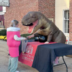 A young lady dressed as a Stanley Cup receives a handful of candy from a friendly, smiling dinosaur during Tuesday’s family friendly event.