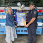 Submitted photo State Farm Agent Jodie Parrack, left, and Owen Poe from the Elkins Fire Department recently joined forces to promote fire safety and raise awareness about lithium-ion battery risks during Fire Prevention Week.