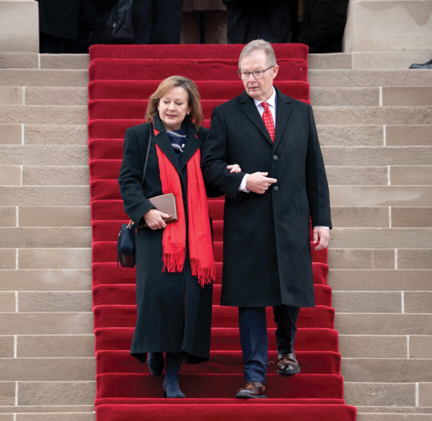 Photo Courtesy/WV Legislative Photography State Treasurer Larry Pack and his wife, Lisa Pack, descend the State Capitol Building north-side steps for inauguration ceremonies on Jan. 13.