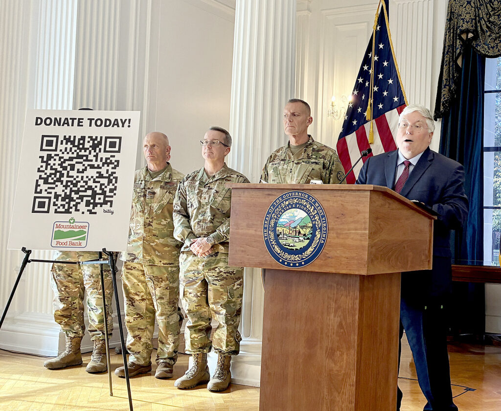 Photo by Steven Allen Adams Gov. Patrick Morrisey, second from right, joined by House Speaker Roger Hanshaw, right, and members of the West Virginia National Guard, announced additional money for food banks and pantries, while also seeking matching monetary donations to the food banks from the public.