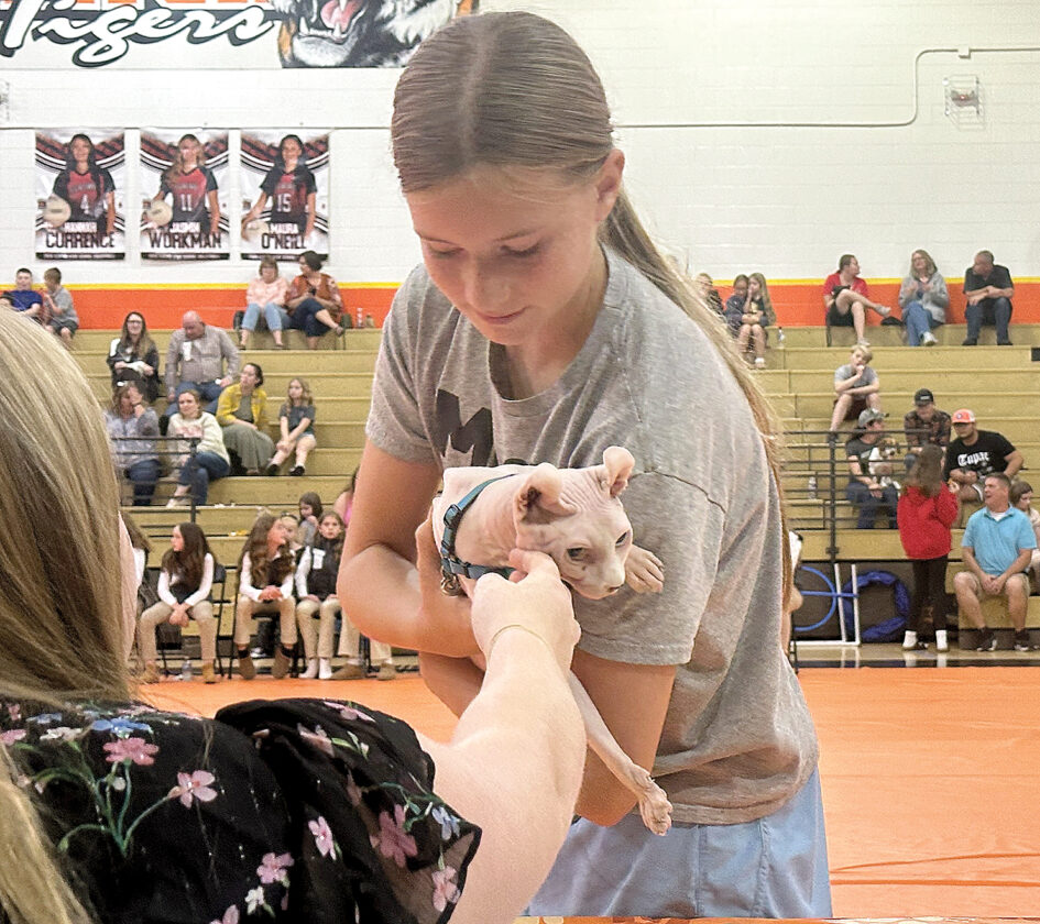 The Inter-Mountain photo by Taylor McKinnie Dobby, the Sphinx, greets the judges during the Cutest Cat category section of the Mountain State Forest Festival Pet Show this week.