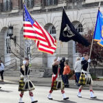 - The West Virginia Highlanders of Post 29 march in front of City Hall during the parade.