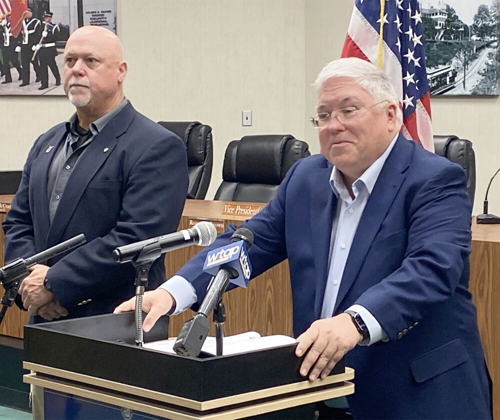 Photo by Brett Dunlap Gov. Patrick Morrisey, with Delegate Dave Foggin, R-Wood, appeared in Parkersburg City Council chambers to announce $16.3 million in West Virginia Victims of Crime Act (VOCA) grants for projects across the state.