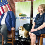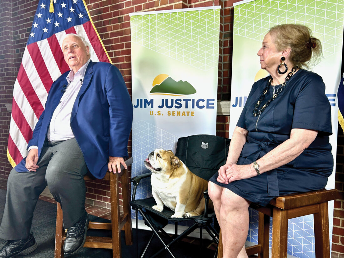 File photo U.S. Sen. Jim Justice, Babydog, and former first lady Cathy Justice greet reporters at the West Virginia Governor’s Mansion following his victory in the 2024 GOP primary for U.S. Senate during his final year as governor.