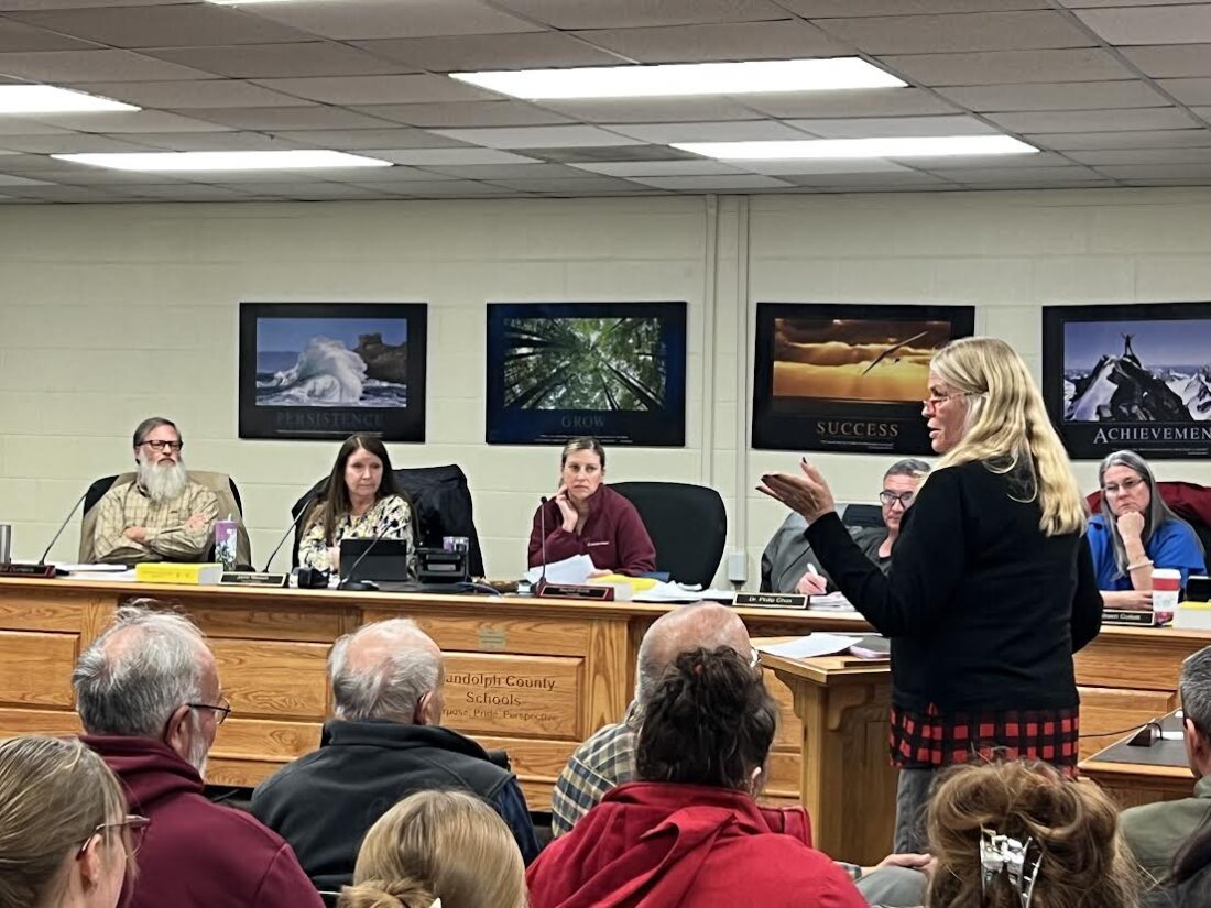 The Inter-Mountain photo by Edgar Kelley Harman School teacher Tammie Swecker addresses the Randolph County Board of Education during Tuesday evening's meeting. A total of 27 speakers urged the BOE members to rescind an October vote to close the K-12 Harman School.
