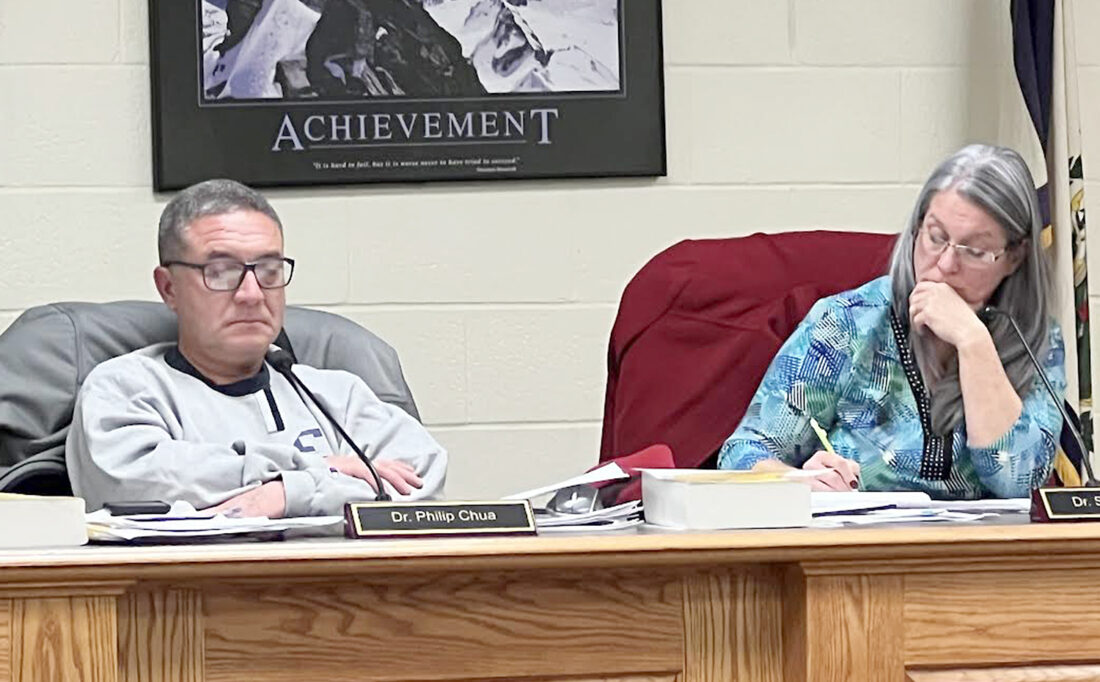 - Randolph County Board of Education members Dr. Phil Chua, left, and Sherri Collett listen in during Tuesday’s BOE meeting.