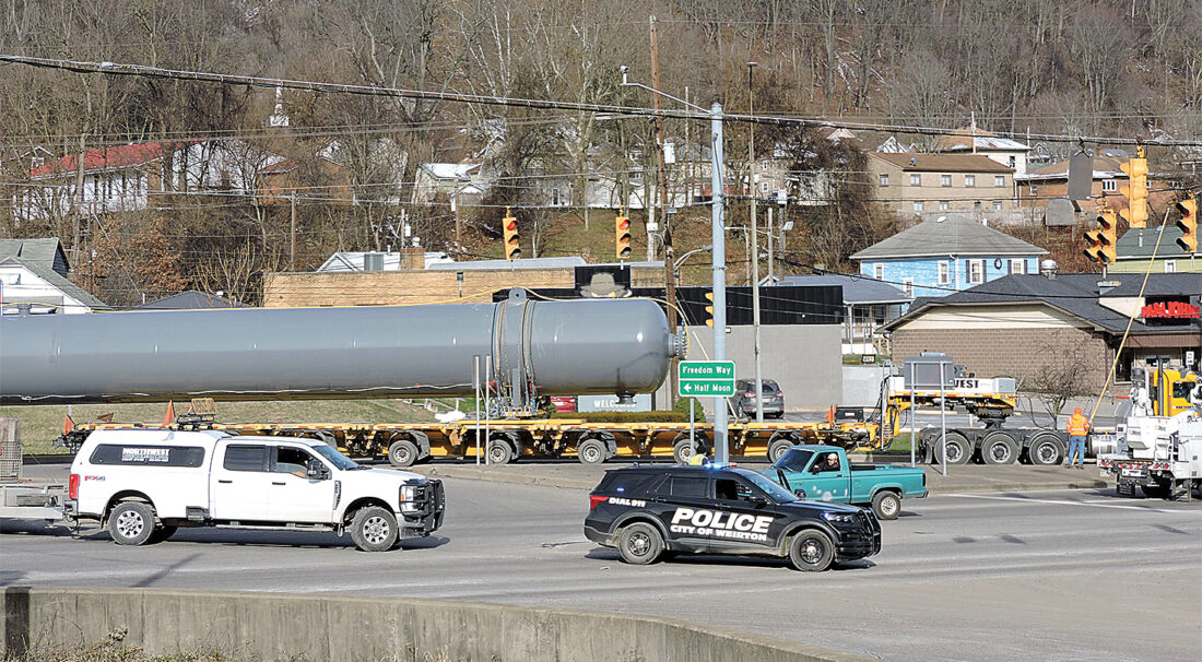 Photo by Craig Howell Escorted by officers from the Weirton Police Department, the third in a series of superload transports made its way through Weirton Monday morning. According to Police Chief Charlie Kush, the equipment was fabricated in St. Marys, and transported via the Ohio River to Weirton, where components were offloaded in the Half Moon Industrial Park and hauled through the city toward a destination in the Burgettstown area. Kush said a fourth transport was scheduled for Wednesday, beginning around 9 a.m., with two more expected sometime next week, all following the same route.