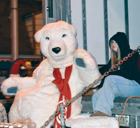 Frosty the Polar Bear waves to the crowd from the back of a Coca-Cola delivery truck during the Elkins Christmas Parade.