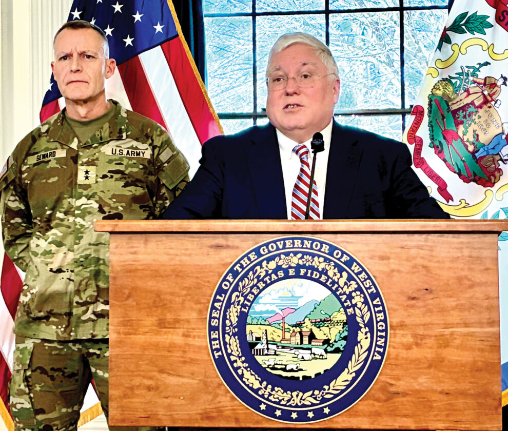 Photo by Steven Allen Adams Gov. Patrick Morrisey and Maj. Gen. James Seward, the adjutant general of the West Virginia National Guard, take questions from the press regarding last week’s shooting of two Guard members in Washington, D.C., on Monday at the State Capitol Building.