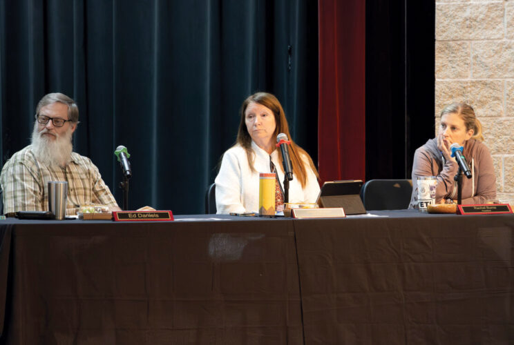 Randolph County Board of Education members, from left, Ed Daniels, Janie Newlon and Rachel Burns listen during a lengthy public hearing at the Elkins High School Theatre.