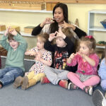 A group of students at the Montessori Early Learning Center in Elkins raise their hands while singing a song with school owner Emily Benigni on Monday afternoon.