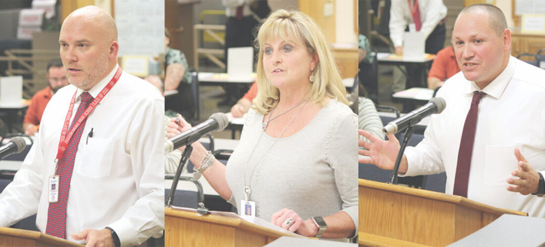 File photo From left, this composite photo shows Parkersburg High School Principal Kenny DeMoss, Parkersburg South High School Principal Betsy Patterson, and Williamstown High School Principal Jason Ward at a 2019 Wood County Board of Education meeting concerning paid student parking.