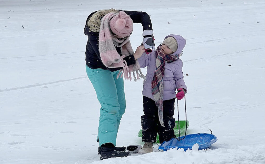 Lasa Rinehart makes sure her daughter, Lakelyn, has all of her warm clothes on correctly as the two prepare to sled down a hill at Davis & Elkins College.