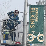 City of Elkins Street Department employees were busy removing Christmas decorations downtown Thursday morning. Steve Stone removes one of the snowflakes from a pole on Davis Avenue.