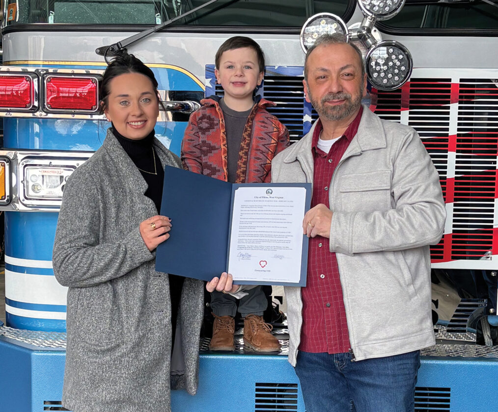 Joining Elkins Mayor Jerry Marco during the Wednesday’s ceremony at the Elkins Fire Department were members of the family of Silas Cooper, who has Congenital Heart Disease, including his mother, Makenzie Cooper.