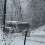 The Inter-Mountain photo by Taylor McKinnie A Davis & Elkins College bus involved in a single-vehicle accident took up both lanes of traffic on Harpertown Road this afternoon. Randolph County EMS, the Elkins Fire Department and the Elkins City Police Department responded to the scene. No one appeared to be injured in the accident.