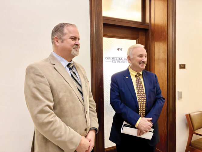 House Finance Committee Vice Chairman Clay Riley, left, and Chairman Vernon Criss, right, take questions following Thursday’s committee meeting where members recommended House Bill 4027, the budget bill, for passage in the full House of Delegates.